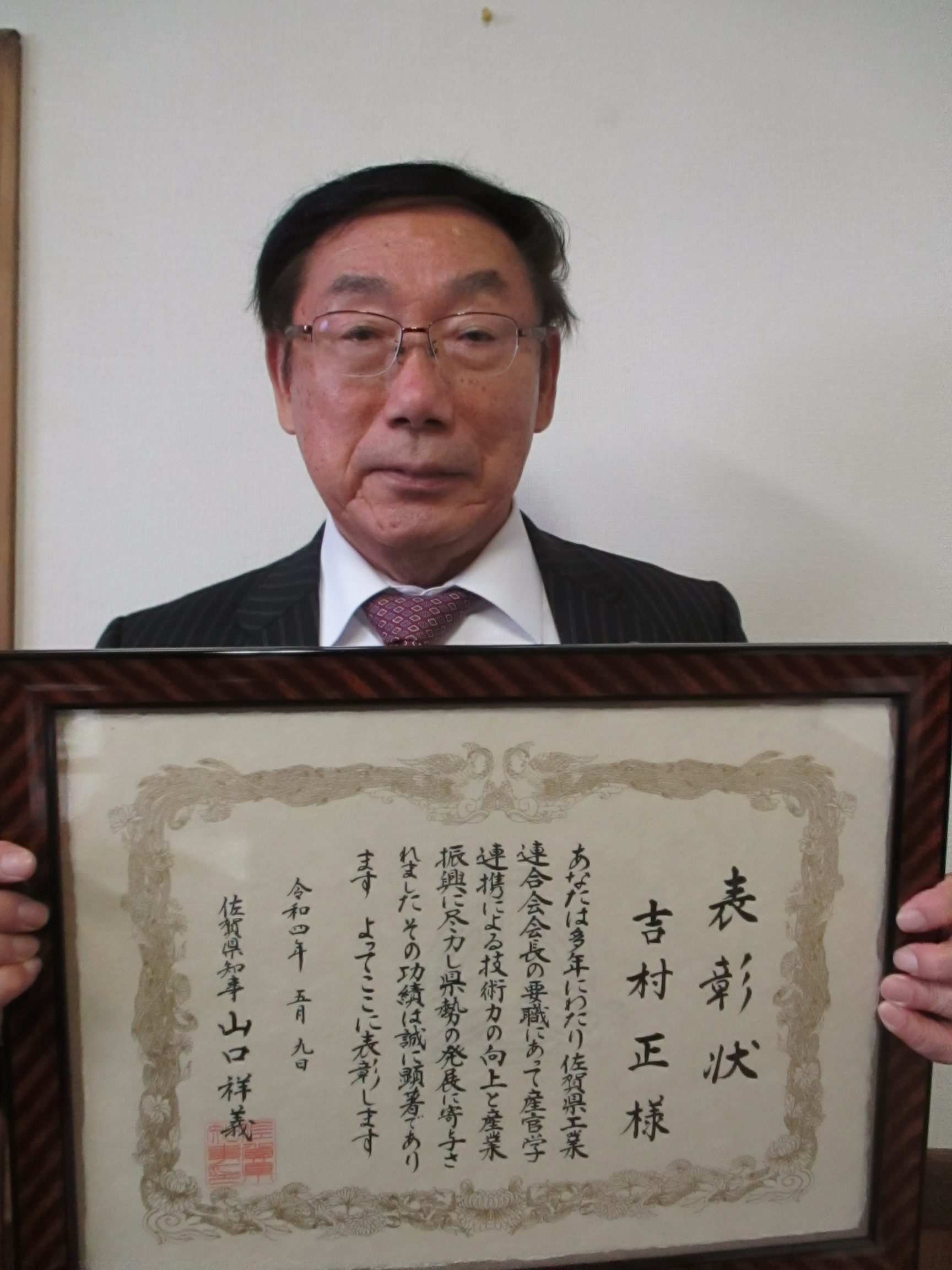 吉村 正は、佐賀市南商工会会長をはじめ佐賀県工業連合会会長等を歴任し、永年にわたり県内経済界の発展に貢献の活動を評価していただき、弊社も大変嬉しくまた誇らしい気持ちでいっぱいです。